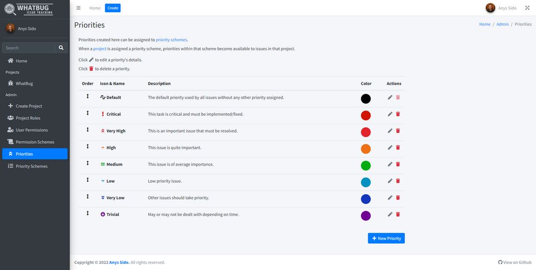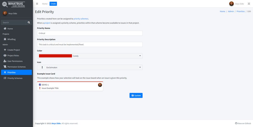 Priorities must have a unique name and there are a selection of icons and colors to choose from. These priority icons will be used throughout the application when an issue's priority needs to be displayed such as on Kanban cards.